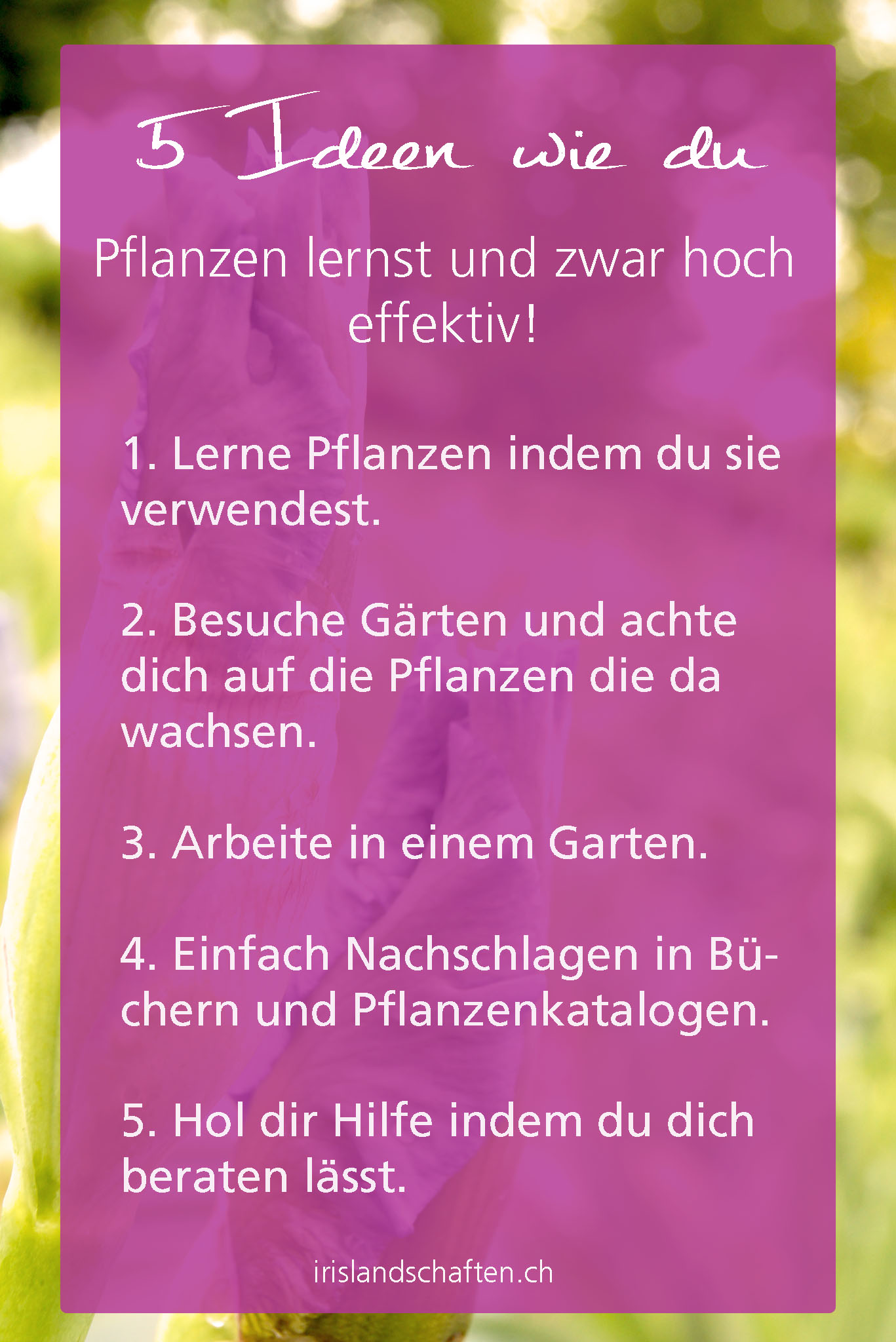 Ich ging nach England um meine Pflanzenkenntnisse zu verbessern und setzte den Blog irislandschaften.ch auf um meine vielen Pflanzenbilder ins Netz hochzuladen. Und was soll ich sagen?